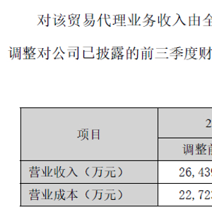 2021年一季度至2021年三季度,锦富技术对上述贸易购销类业务以总额法确认营业收入,今年3月,锦富技术对该业务进行会计差错调整,由总额法调整为按净额法确认收入。2021年第一季度营业收入由2.64亿元更正为2.12亿元,半年度营业收入由5.27亿元更正为4.16亿元,前三季度合计营业收入由8.31亿元更正为6.6亿元。由于差错调整,2021年前三季度锦富技术的营业收入累计相差1.7亿元。
