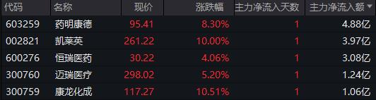 从资金流向来看,生物医药板块获主力资金净流入超17亿元,药明康德、凯莱英、恒瑞医药分别获加仓4.88亿元、3.97亿元、3.08亿元。