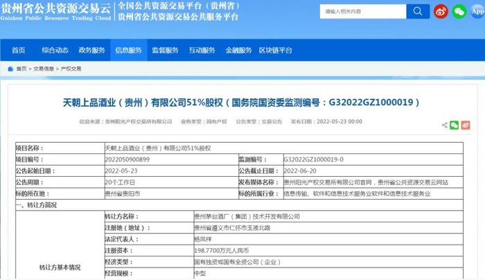 5月23日,贵州阳光产权交易所有限公司官网和贵州省公共资源交易云网站同步公开披露,经茅台集团董事会批准,贵州茅台酒厂(集团)技术开发有限公司将转让天朝上品酒业(贵州)有限公司51%股权。