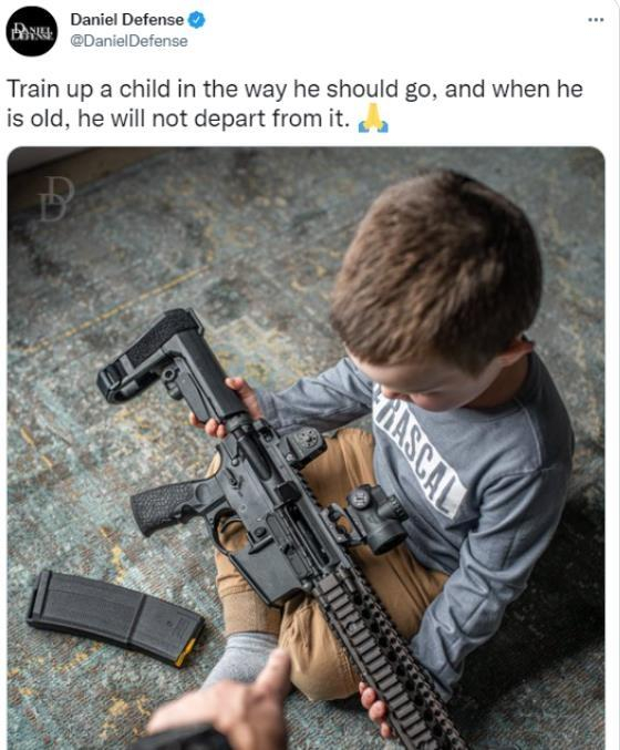 5月16日,丹尼尔防务公司在推特上发布一则广告,内容是一名小男孩席地而坐,把玩一把突击步枪,配文却是“教育孩子使他走正道,他长大之后就不会走歪路”,并附带一个祈祷的手势。