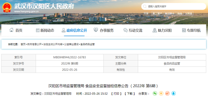中国质量新闻网讯 近日,武汉市汉阳区市场监督管理局发布食品安全监督抽检信息公告(2022年 第6期)。据公告,汉阳区市场监督管理局组织检测机构对该本辖区生产经营企业开展了食品安全抽检,近期抽检信息如下: