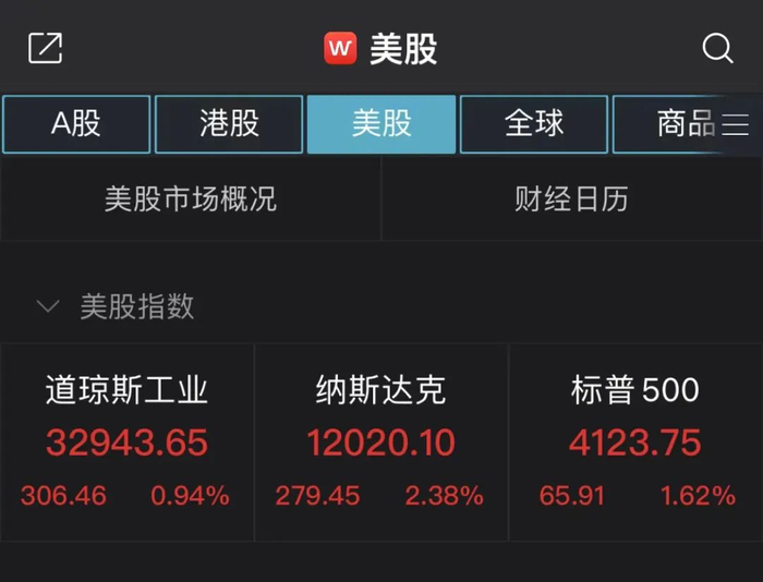 当地时间周五,美股三大指数集体高开,截至发稿,道指涨近1%,纳指涨2.38%,标普500指数涨1.62%。