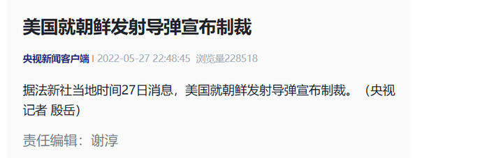 据央视新闻,法新社当地时间27日消息,美国就朝鲜发射导弹宣布制裁。