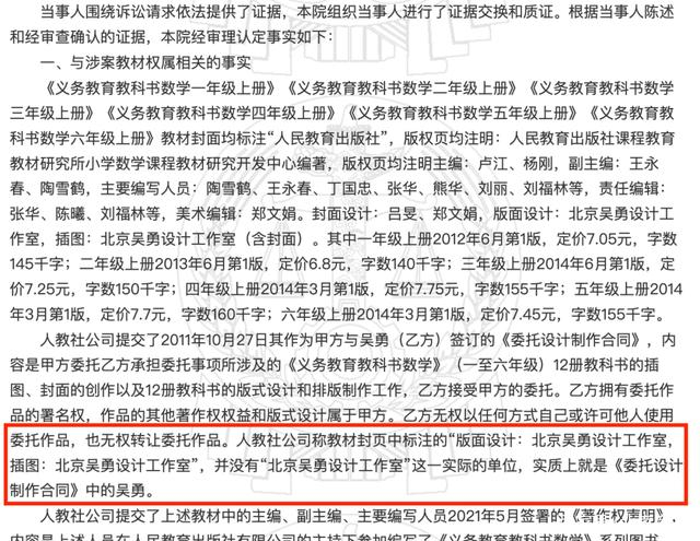 这份判决书的当事双方是厦门一公司跟人教社公司的纠纷,跟吴勇并没有关系,但意外的是,在判决书中,透露了有关人教社公司与北京吴勇设计工作室的合作细节。据判决书显示,2011年10月27日,人教社公司作为甲方与吴勇(乙方)签订的《委托设计制作合同》,内容是甲方委托乙方承担委托事项所涉及的《义务教育教科书数学》(一至六年级)12册教科书的插图、封面的创作以及12册教科书的版式设计和排版制作工作,乙方接受甲方的委托。乙方拥有委托作品的署名权,作品的其他著作权权益和版式设计属于甲方。乙方无权以任何方式自己或许可他人使用委托作品,也无权转让委托作品。
