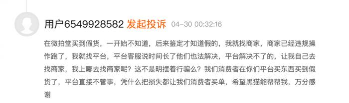 4月30日,有消费者投诉称,买到赝品后,平台无法对商家进行约束,没法为消费者退款。