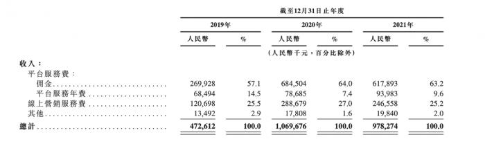 2019-2021年,微拍堂佣金占总营收的比例维持在57%以上,是绝对的大头。其中,2021年佣金收入为6.18亿元,占总收入63.2%。