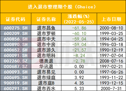 5月25日,有6家公司进入退市整理期,整理期首个交易日,其中有4只跌幅近60%,退市昌鱼跌幅达到61.85%。