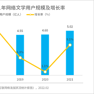 报告显示,2021年中国网络文学产业规模达到358亿元,同比增长24.1%,用户规模5.02亿,占网民整体48.6%,同比增长9.1%。中国数字文化产业规模达到7841.6亿元,同比增长14.7%。网络文学的IP全版权运营带动了游戏、影视、动漫、音乐、音频等合计约3037亿元的市场,即网络文学及其IP运营对数字文化产业的影响范围将近40%。影响范围比2020年增加了约2个百分点。