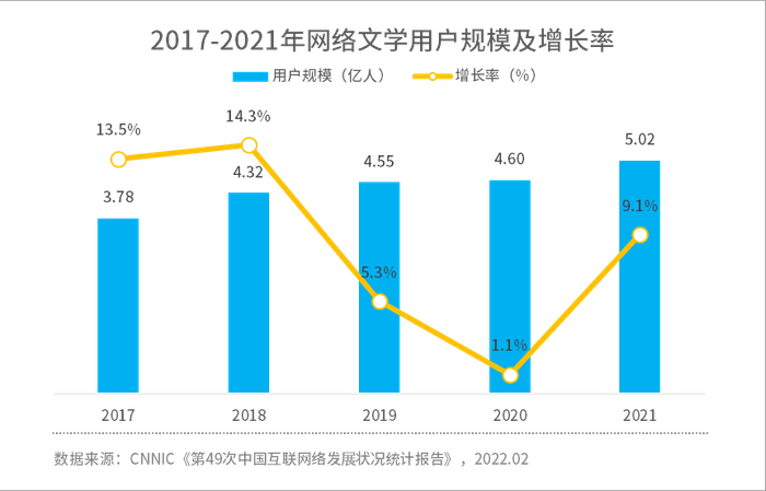 2017-2021年网络文学用户规模及增长率。(图片来自《2021年中国网络文学版权保护与发展报告》)。
