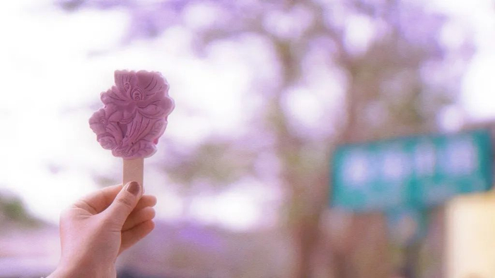 五华区还联合云南讲武文化科技有限公司设计蓝花楹主题雪糕,灵动的造型,淡蓝的色彩,引得市民争相尝鲜,并作为“到此一游”的道具拍照留念。