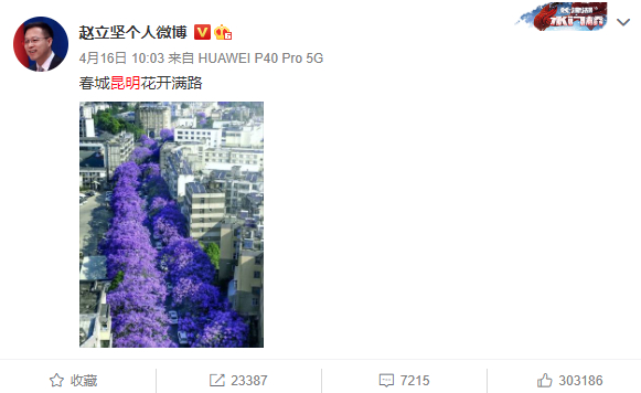 今年4月16日,外交部新闻司副司长、第31任发言人赵立坚在其微博@赵立坚个人微博上发布了一张“春城昆明花开满路”的美图,图中大片的蓝花楹开满了春城昆明的街道。网友纷纷留言点赞,“明丽的紫色花海尽显昆明的浪漫气息”“春城一幅画,昆明万卷诗”……