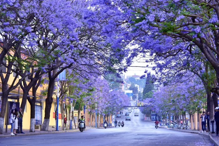 因蓝花楹的带动效应,昆明市盘龙江边、翠湖、北京路片区、红锦路、前卫西路、环湖路和宝海公园等10余条道路和街头小游园,均能看到蓝花楹怒放的身影。