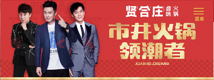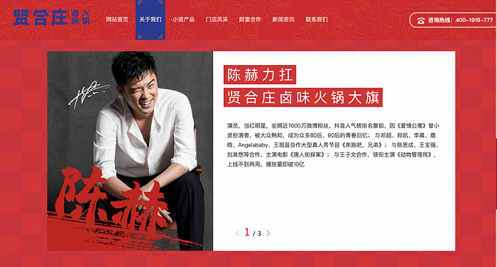 但是不管陈赫是否已经退出了贤合庄,其作为昔日股东,陈赫的个人形象已经与贤合庄的经营与品牌深度捆绑。截止至2022年5月23日,我们访问了贤合庄的官方网站,仍然随处可见陈赫、朱桢、李晨等人的形象宣传,并在他们的个人形象旁标记了“明星合伙人”的字样。官网资料中还显示“陈赫力扛贤合庄卤味火锅大旗”等宣传语。