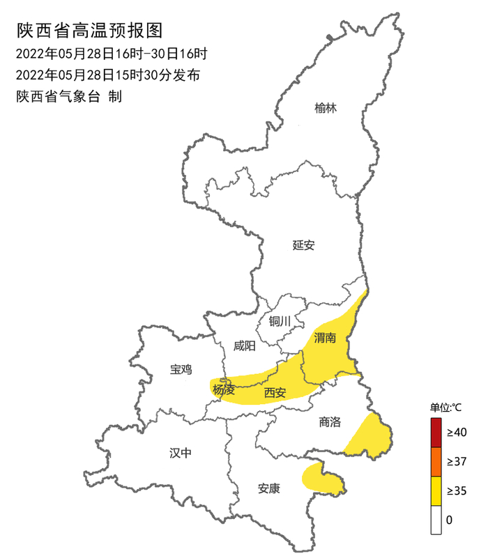 预计未来48小时,西安大部、渭南大部、咸阳南部、宝鸡东部局地、杨凌、商洛东部、安康东部局地有35℃及以上高温天气,局地可达37℃以上。