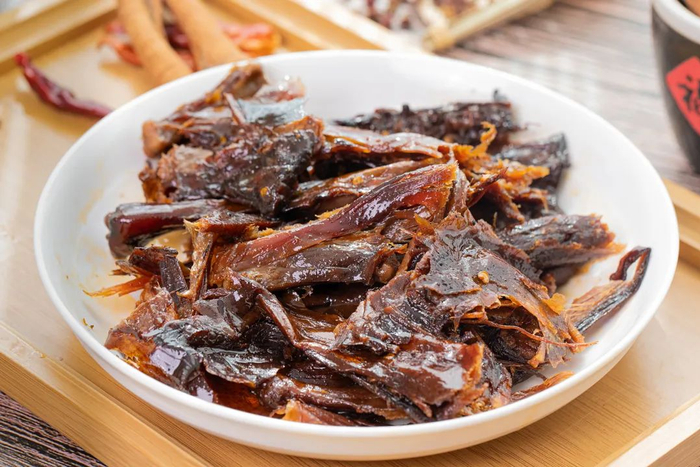 油亮的色泽,肉质丝丝分明,特别有嚼劲;看着鸭子瘦,全是“腱子肉”,比牛肉干耐嚼,却不干不柴。