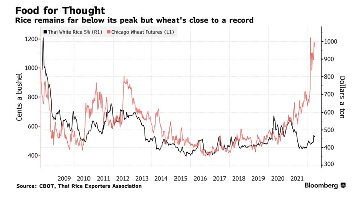 与小麦价格接近历史最高纪录不同,大米价格仍远低于峰值水平。