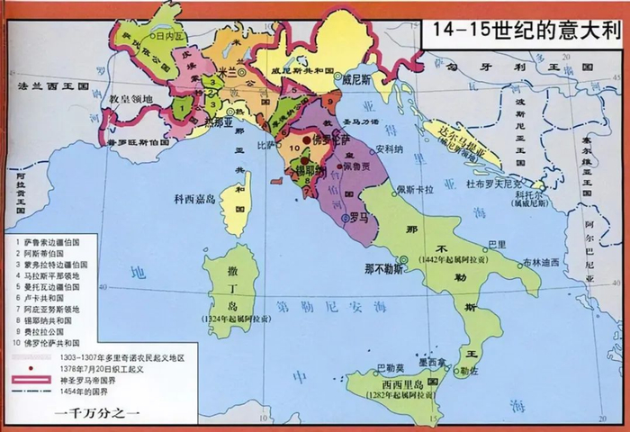 帝国治下的意大利也陷入分裂,半岛上邦国林立。地中海商业贸易的繁荣还催生了沿海地区一众商业城邦,如威尼斯、热那亚等共和国。