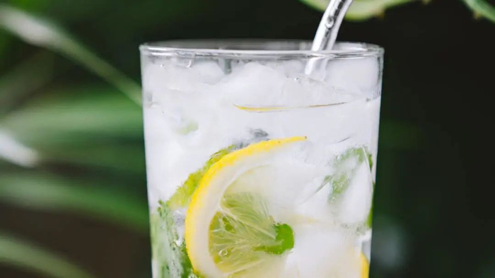 ——加入冰块、以薄荷叶、柠檬片装饰。