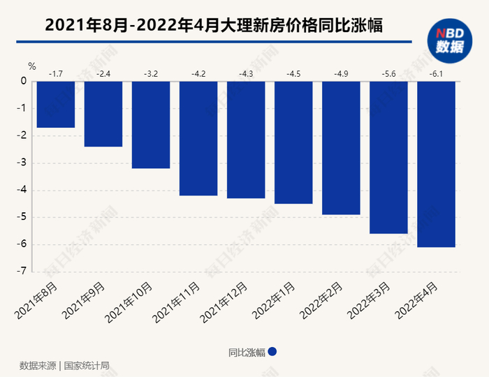 事实上,据国家统计局数据,自去年5月起,大理新房便开始同比下降,当月跌幅为0.2%,随后跌幅不断加大,今年1-3月的同比跌幅分别达到4.5%、4.9%、5.6%。中国房价行情网数据显示,4月份大理新房均价12068元/平方米,二手房均价为12767元/平方米。