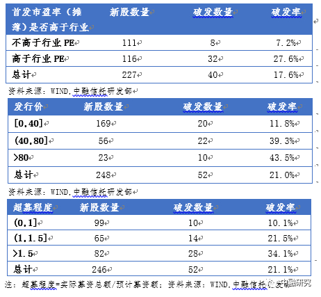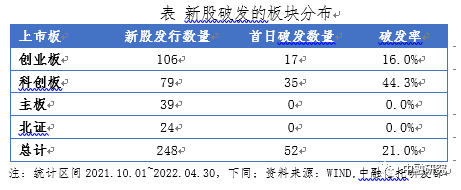 我们对2021.10.01~2022.4.30期间发行的新股相关数据进行了统计,发现破发的新股呈现如下特征: