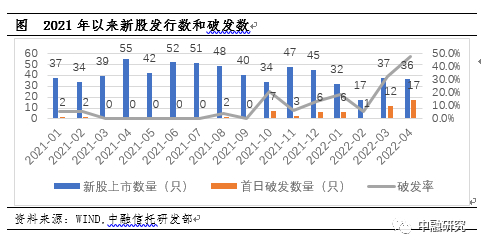 近期,新股破发潮频现引发市场关注。根据我们的统计,从2021年10月至2022年4月底,此轮新股破发已持续了半年多时间。这期间,新股上市数量总计248只,首日破发数52只,破发率21%。其中2022年3月、4月,破发潮达到高峰,首日破发数量达到12只、17只,破发率达到32%、47%。换言之,4月有一半的新股上市首日即跌破发行价。