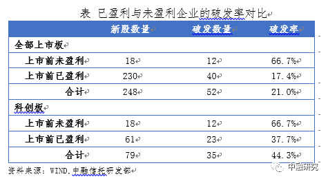 未盈利的企业破发概率更高。当前只有科创板允许未盈利企业上市,因此未盈利企业都集中在科创板。从统计来看,上市前未盈利的公司有18家,其中12家破发。换言之,未盈利的公司有三分之二破发。对比来看,全部上市板已盈利的公司破发率只有17%,科创板已盈利的公司破发率为37%。