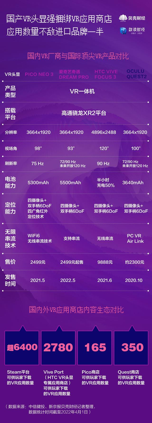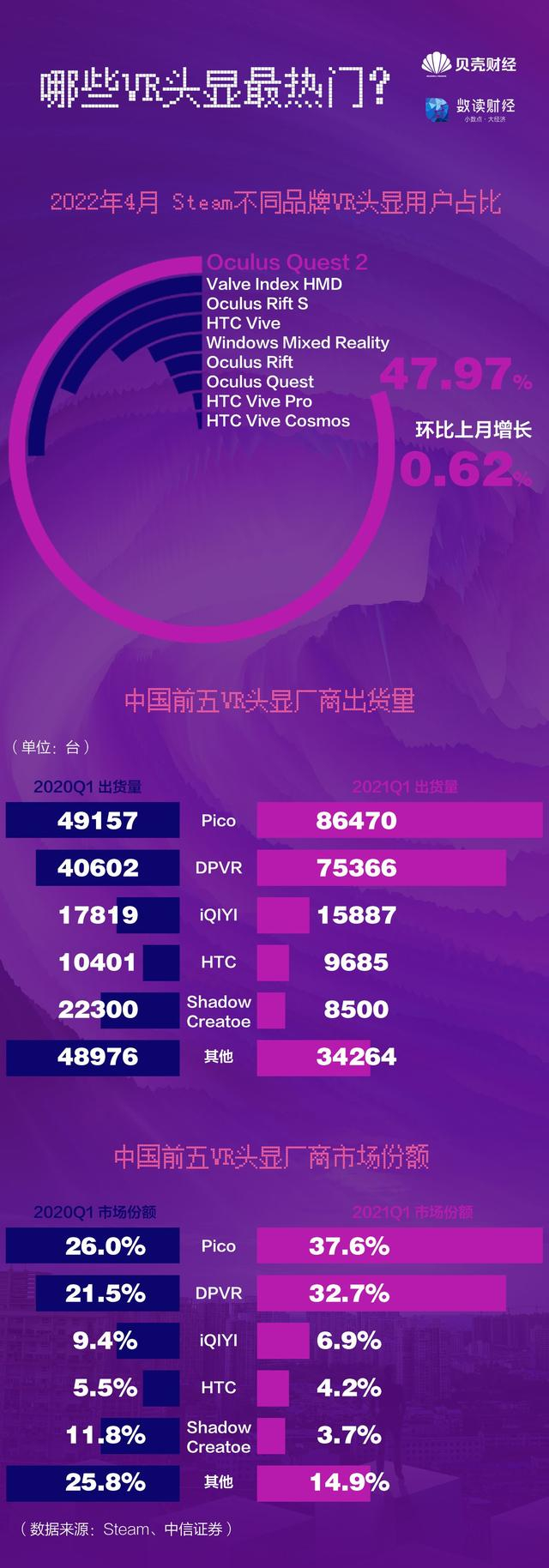 新京报贝壳财经记者梳理IDC报告发现,2021年,Meta旗下的Oculus系列在VR头显市场占有率达80%。Steam数据显示,2022年4月,Steam平台VR头显用户占比方面,Oculus Quest2用户占比最高,为47.97%,环比上月增长0.62%,在众多头显中环比涨幅最高。字节旗下的Pico系列头显整体保持涨势,占比0.67%;Pico New 3、Pico Neo 2用户占比分别为0.64%和0.03%。