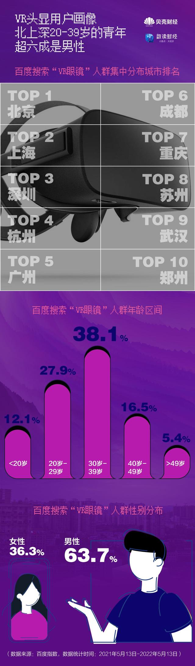 百度指数显示,在2021年5月13日-2022年5月13日之间搜索“VR眼镜”的人群中,来自北京、上海、深圳的用户最多,其次以来自杭州、广州、成都等城市的用户为主。这些搜索“VR眼镜”的人群,年龄区间位于30岁-39岁的最多,占比为38.1%;其次为年龄区间位于20岁-29岁的人群,占比为27.9%。