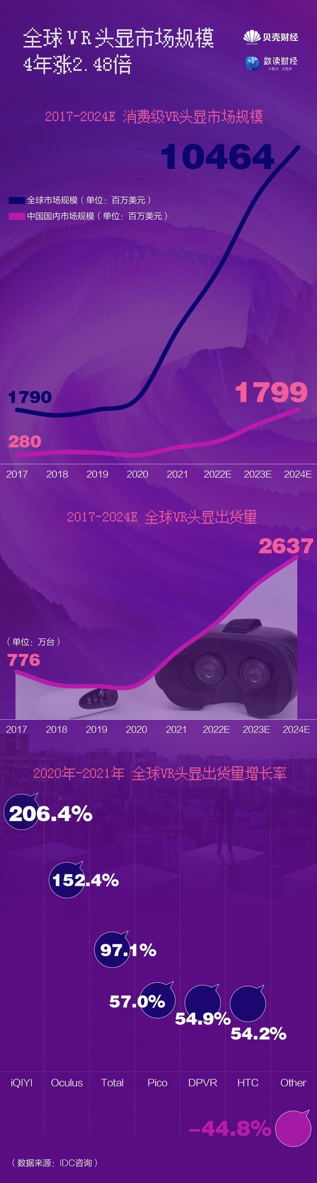 随着元宇宙概念的大火,资本再次涌入VR赛道,不少知名企业如华为、腾讯、字节跳动、苹果、谷歌等科技巨头都在VR领域进行相关布局。字节跳动更是在去年8月高调收购了Pico。爱奇艺的奇遇系列也在全球VR头显市场占据了一定份额。