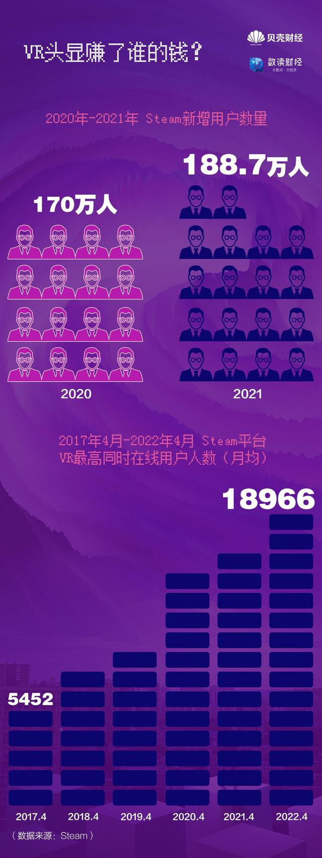 Steam平台数据显示,2021年,VR用户同比上年新增188.7万人,新VR用户增长率为 11%。