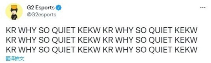 在对抗赛的开幕战上,来自欧洲赛区的G2击败T1之后,延续了这支队伍一贯以来爱在社交平台上整活的风格,在推特上连发了六句一模一样的“KR WHY SO QUIET KEKW(为什么韩国观众这么安静)”,来表达对现场观众的不满。