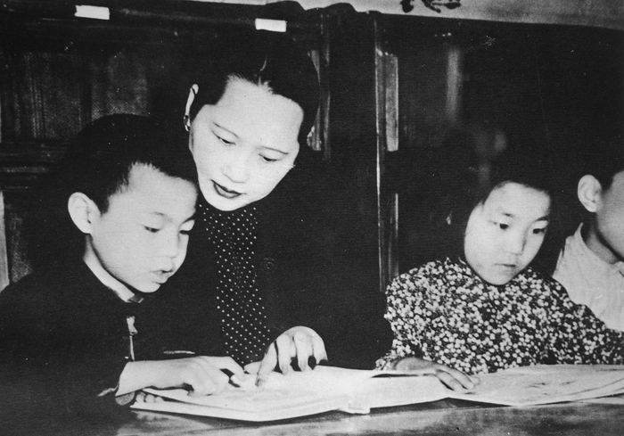 1947年,中国福利基金会在上海创办了三个儿童福利站。这是宋庆龄在指导识字班的孩子们在读书时的留影。