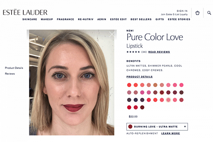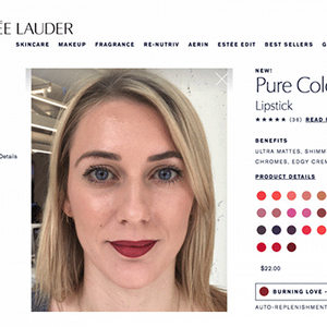雅诗兰黛的官网上也安置了AR虚拟试妆功能,只要有照片就能测试用户喜欢的化妆品。除了试妆方便外,该功能还会根据实际模型的质地完成一些产品,比如用来区别光滑唇膏和哑光唇膏,此外面部追踪工具还能现场捕捉用户的眼睛和嘴唇轮廓。