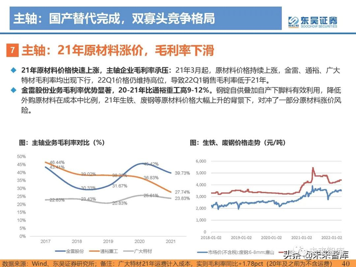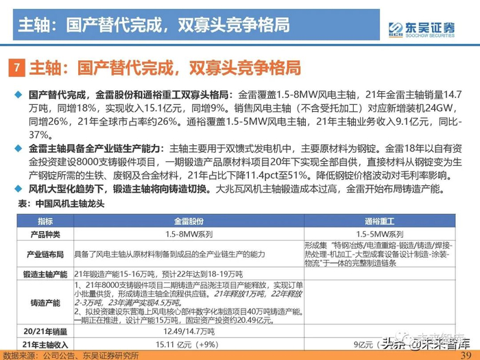 国产替代完成,金雷股份和通裕重工双寡头格局:金雷覆盖1.5-8MW风电主轴,21年金雷主轴销量14.7 万吨,同增18%,实现收入15.1亿元,同增9%。销售风电主轴(不含受托加工)对应新增装机24GW, 同增26%,21年全球市占率约26%。通裕覆盖1.5-5MW风电主轴,21年主轴业务收入9.1亿元,同比37%。