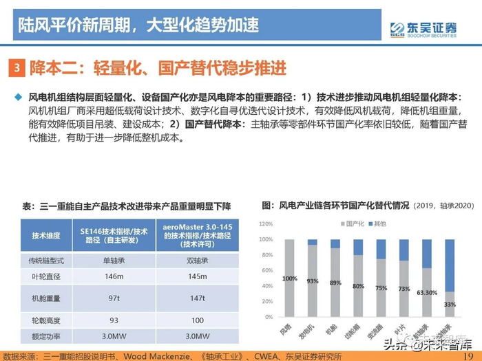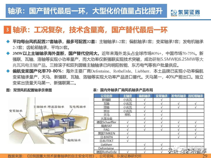 3MW以上主轴轴承海外垄断,国产替代空间大。近年来海外龙头占全球市场80%+,中国市场70-75%。新 强联、瓦轴、洛轴等实现小功率量产,而大功率仅新强联实现技术突破,成功研制5.5MW和6.25MW等大 兆瓦风电主轴产品。三排滚子和双列圆锥主轴轴承已向明阳智能、东方电气等客户批量供应。