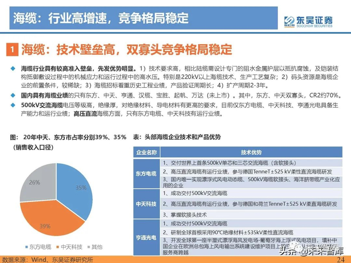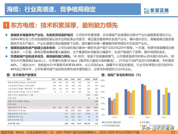 高端技术储备率先产业化,先发优势筑就护城河:公司技术积累深厚,在向高端产品渗透的过程中产业化速度更是领先行业, 500kV单芯及三芯交流海缆软接头技术应用皆系业内首次;高压直流海缆率先实现产业化,填补国内空白,具备超高压直流海 缆技术及生产能力,产业化速度在深远海趋势下加快;国内最早且唯一掌握海洋脐带缆技术并实现产业化。