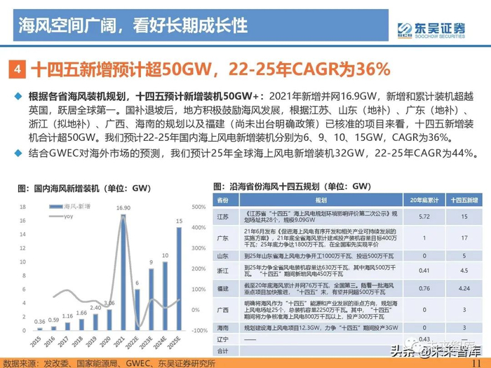 根据各省海风装机规划,十四五预计新增装机50GW+:2021年新增并网16.9GW,新增和累计装机超越 英国,跃居全球第一。国补退坡后,地方积极鼓励海风发展,根据江苏、山东(地补)、广东(地补)、 浙江(拟地补)、广西、海南的规划以及福建(尚未出台明确政策)已核准的项目来看,十四五新增装 机合计超50GW。我们预计22-25年国内海上风电新增装机分别为6、9、10、15GW,CAGR为36%。(报告来源:未来智库)