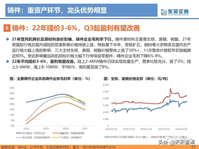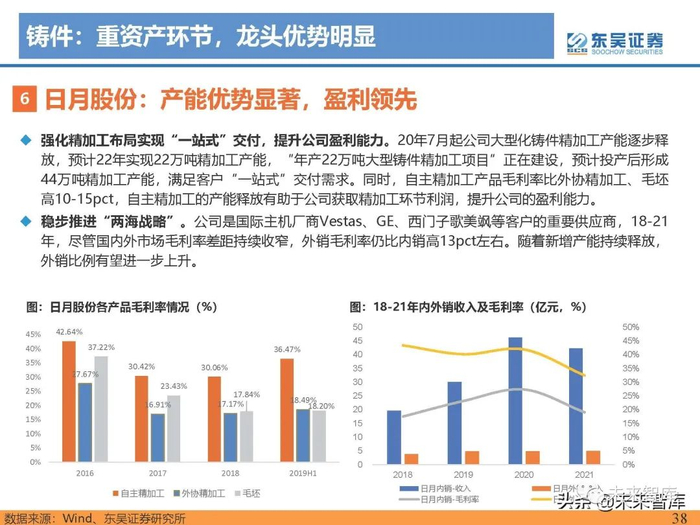 强化精加工布局实现“一站式”交付,提升公司盈利能力。20年7月起公司大型化铸件精加工产能逐步释 放,预计22年实现22万吨精加工产能,“年产22万吨大型铸件精加工项目”正在建设,预计投产后形成 44万吨精加工产能,满足客户“一站式”交付需求。同时,自主精加工产品毛利率比外协精加工、毛坯 高10-15pct,自主精加工的产能释放有助于公司获取精加工环节利润,提升公司的盈利能力。