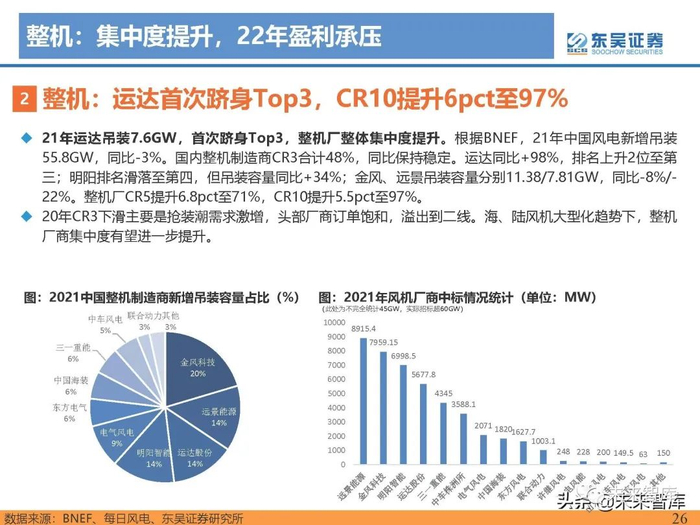 21年运达吊装7.6GW,首次跻身Top3,整机厂整体集中度提升。根据BNEF,21年中国风电新增吊装 55.8GW,同比-3%。国内整机制造商CR3合计48%,同比保持稳定。运达同比+98%,排名上升2位至第 三;明阳排名滑落至第四,但吊装容量同比+34%;金风、远景吊装容量分别11.38/7.81GW,同比-8%/- 22%。整机厂CR5提升6.8pct至71%,CR10提升5.5pct至97%。