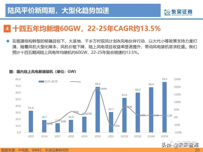 在能源结构转型的明确目标下,大基地、千乡万村驭风计划&风电伙伴行动、以大代小等政策支持力度打 满,随着风机大型化降本,风机价格下降,陆上风电项目收益率显著提升,带动风电装机需求旺盛。我们 预计十四五期间陆上风电年均装机约60GW,22-25年复合增速约13.5%。