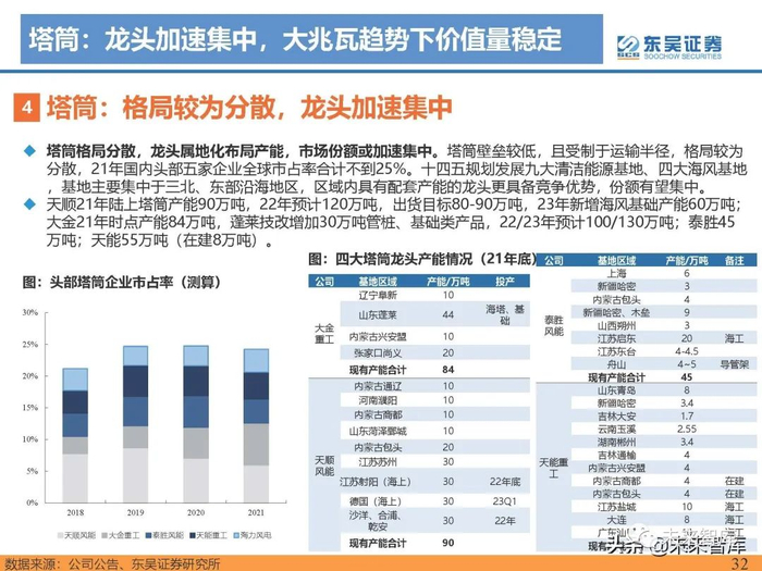 塔筒格局分散,龙头属地化布局产能,市场份额或加速集中。塔筒壁垒较低,且受制于运输半径,格局较为 分散,21年国内头部五家企业全球市占率合计不到25%。十四五规划发展九大清洁能源基地、四大海风基地 ,基地主要集中于三北、东部沿海地区,区域内具有配套产能的龙头更具备竞争优势,份额有望集中。