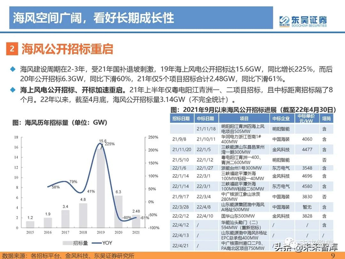 海上风电公开招标、开标加速重启。21年上半年仅粤电阳江青洲一、二项目招标,且中标距离招标隔了8 个月。22年以来,截至4月底,海风公开招标量3.14GW(不完全统计)。