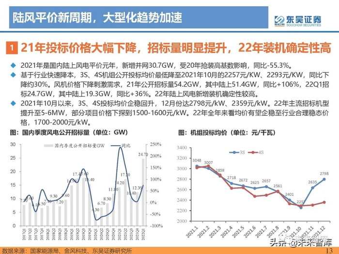 基于行业快速降本,3S、4S机组公开投标均价最低降至2021年10月的2257元/KW、2293元/KW,同比下 降约30%。风机价格下降刺激需求,21年公开招标量54.2GW,其中陆上51.4GW,同比+106%,22Q1招 标24.7GW,其中陆上19.3GW,同比+36%。22年陆上风电新增装机确定性较高。