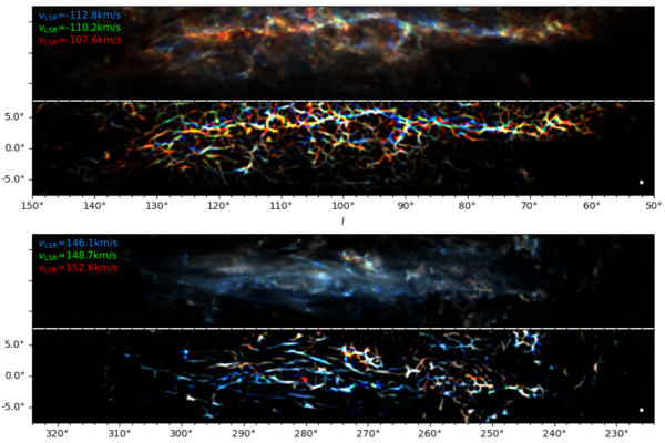 在这次最新的中性氢纤维结构研究中, 研究者将Soler等人(2020)的分析扩展到整个银河系银盘,在银河系的经度和纬度上进行扩展。文章作者也解释,他们的研究目的不是将中性氢的这些纤维状结构定义为三维空间中的物体,例如旋臂或细气体链,而是为了研究银河系银盘中原子气体分布的一般各向异性。