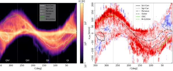 图一:银河系银盘经度-视线速度图:作者用不同的线标明出了银河系主要的旋臂结构。左图的颜色代表中性氢原子的辐射强度,而众多纤维结构就暗藏其中。右图则展示了利用Rayleigh统计给出的不同纤维结构的指向。