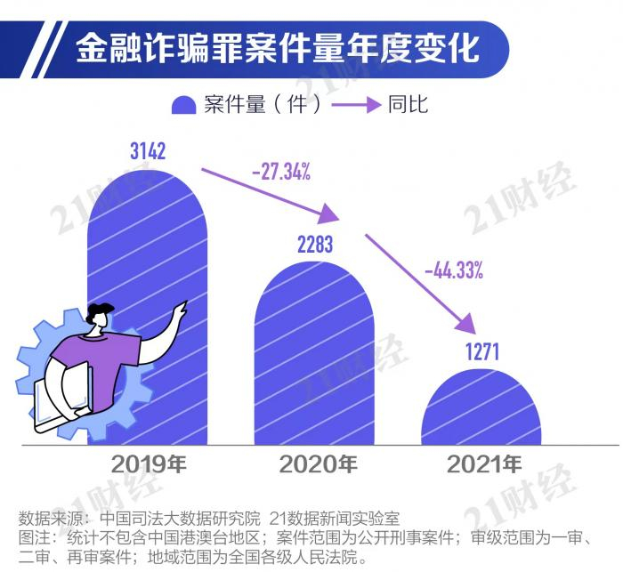 为进一步剖析金融诈骗现状、问题特点及案件特征,21财经客户端“爆料通”联合中国司法大数据研究院基于中国裁判文书网已公开的文书进行技术分析。数据显示,金融诈骗风险呈现逐年缓解趋势,各类犯罪在数量上均有所下降,网络化特征日益凸显。