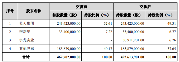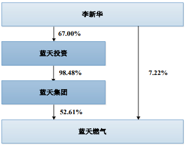 截至报告书签署日,蓝天燃气总股本为46,270.20万股,蓝天集团持股比例为52.61%,为蓝天燃气的控股股东。李新华持有蓝天投资67.00%的股权,蓝天投资持有蓝天燃气控股股东蓝天集团98.48%的股权,李新华还直接持有蓝天燃气7.22%的股份,李新华为蓝天燃气的实际控制人。本次交易拟发行股份数量为30,911,901.00股,交易完成后蓝天燃气总股本增至493,613,901.00股,股本扩大6.68%,控股股东蓝天集团及实际控制人李新华分别直接持有本次交易完成后总股本的49.31%和6.77%。