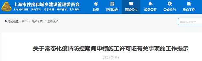 上海市住建委发布关于常态化疫情防控期间申领施工许可证有关事项的工作提示