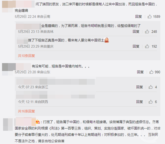 这条微博迅速引起网友关注,评论区则成了“翻车现场”,不少网友都对这则截图常识性的错误进行了批评:“姐告是中国的,不是缅甸”“姐告不是个市。姐告属于瑞丽市。”更有网友严肃的指出:“姐告属于中国,和缅甸木姐接壤。该微博属于典型的虚假信息。”