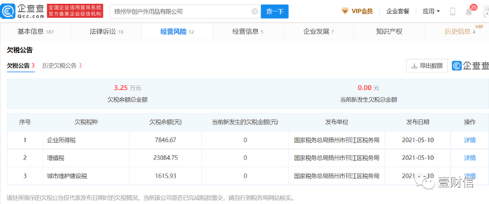 据企查查,扬州华创曾经欠企业所得税、增值税及城市维护建设税总金额为3.25万元;扬州欧兰特曾欠企业所得税金额为2,300.08元。